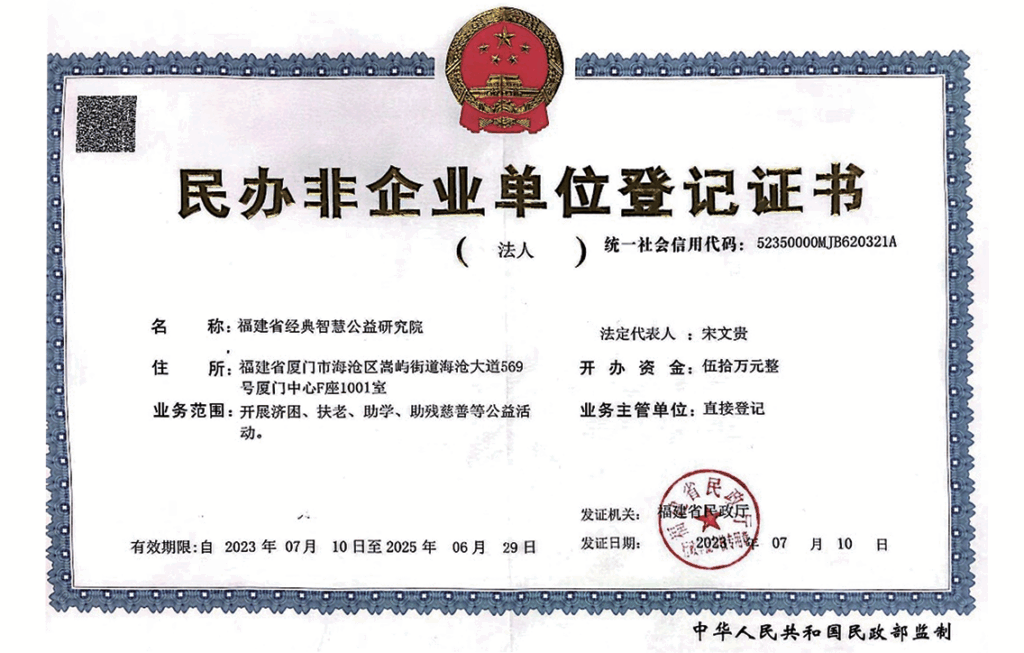 福建省经典智慧公益研究院”正式成立于2021年6月30日,是福建省民政厅直接登记的一家慈善性质的民办非企业单位。2024 年被评为 5A 级社会组织,是福建省慈善总会会员单位,中国家庭教育学会会员单位。